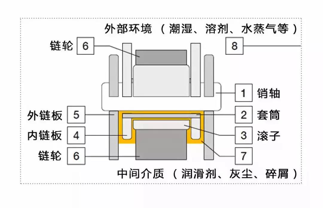 鏈條的種類多樣,常見的類型有滾子鏈,套筒鏈,齒形鏈等。其中,涉及的摩擦點(diǎn)有: